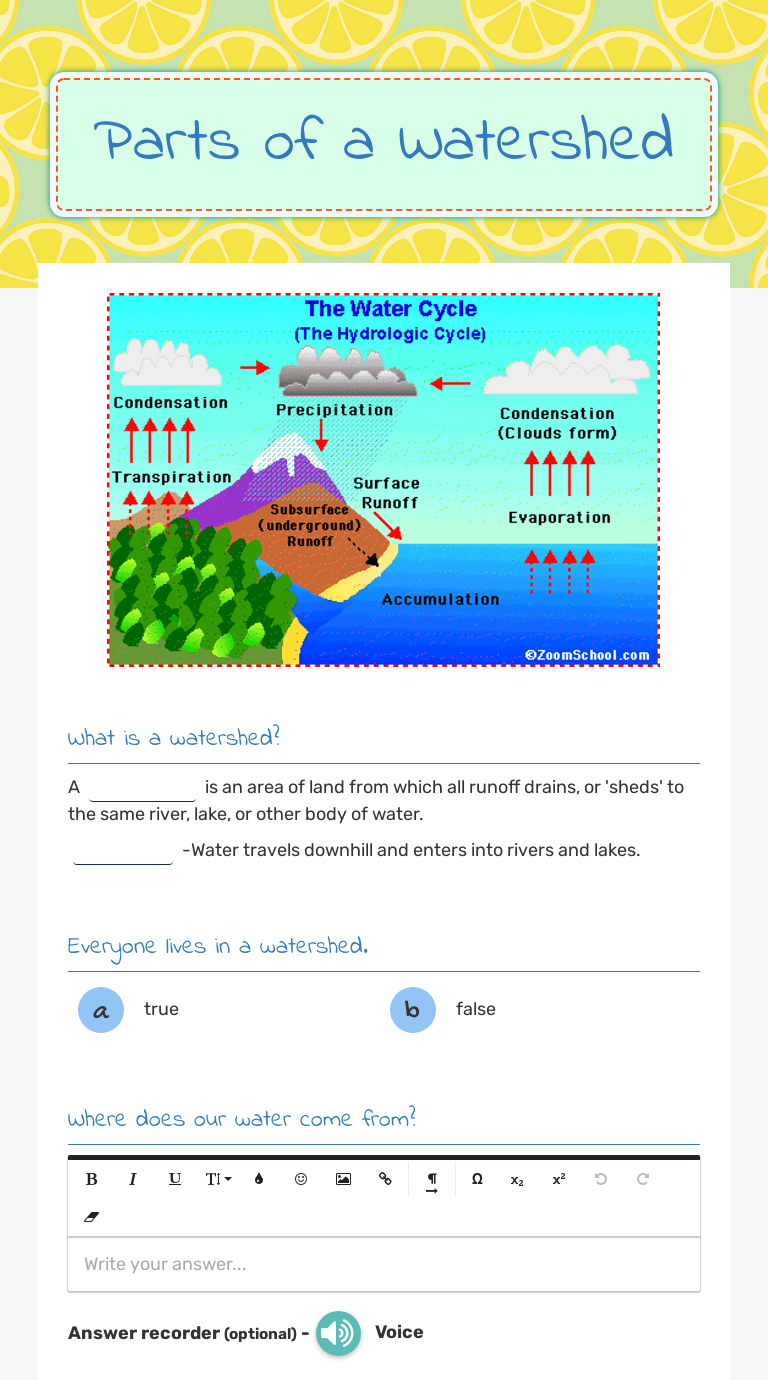 A watershed is often called a drainage basin. The area of land that water moves over . Add to my workbooks (1) Watersheds and aquifers other contents: Hand out the "find your watershed" worksheet. One 8.5" x 11" sheet of paper per student, preferably graph paper. Correlations & assessment worksheet by activity. It is the land area drained by a network of. What might make a watershed blue., or brown.,, or green? Ninth grade through twelfth grade. Have students give ideas of what they think a watershed is now. Browse watershed worksheet resources on teachers pay teachers, a marketplace trusted.
